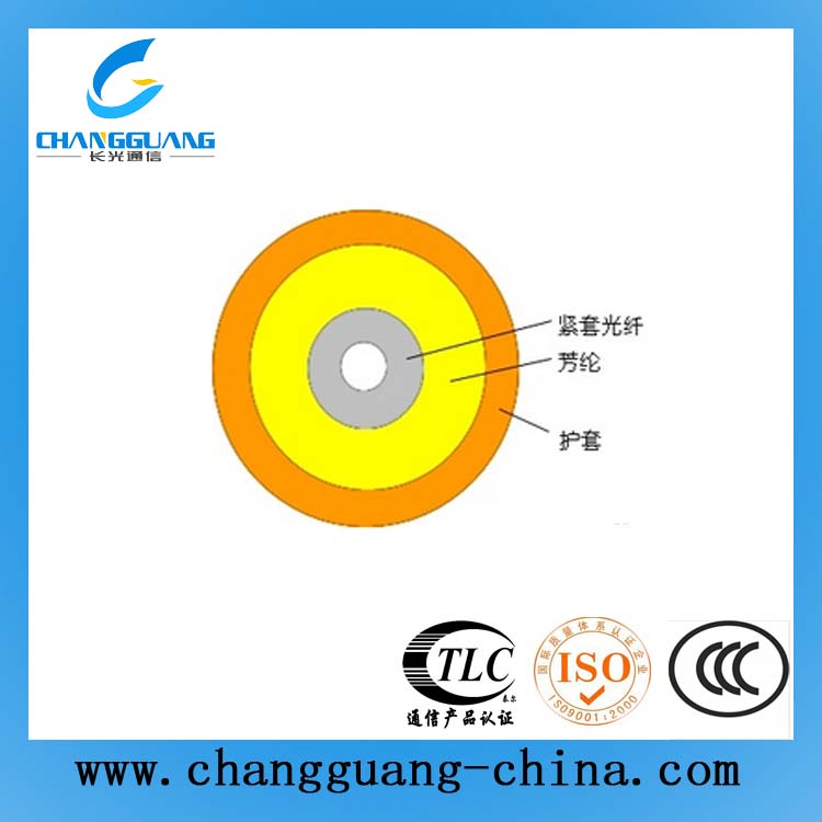 單芯光纜使用單根Φ900μm或Φ600μm阻燃緊套光纖作為光傳輸介質(zhì),外覆一層芳綸作為受力加強(qiáng)單元,最外擠制一層聚氯乙烯(PVC)或低煙無鹵材料(LSZH,低煙、無鹵、阻燃)護(hù)套而成。