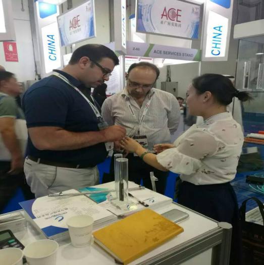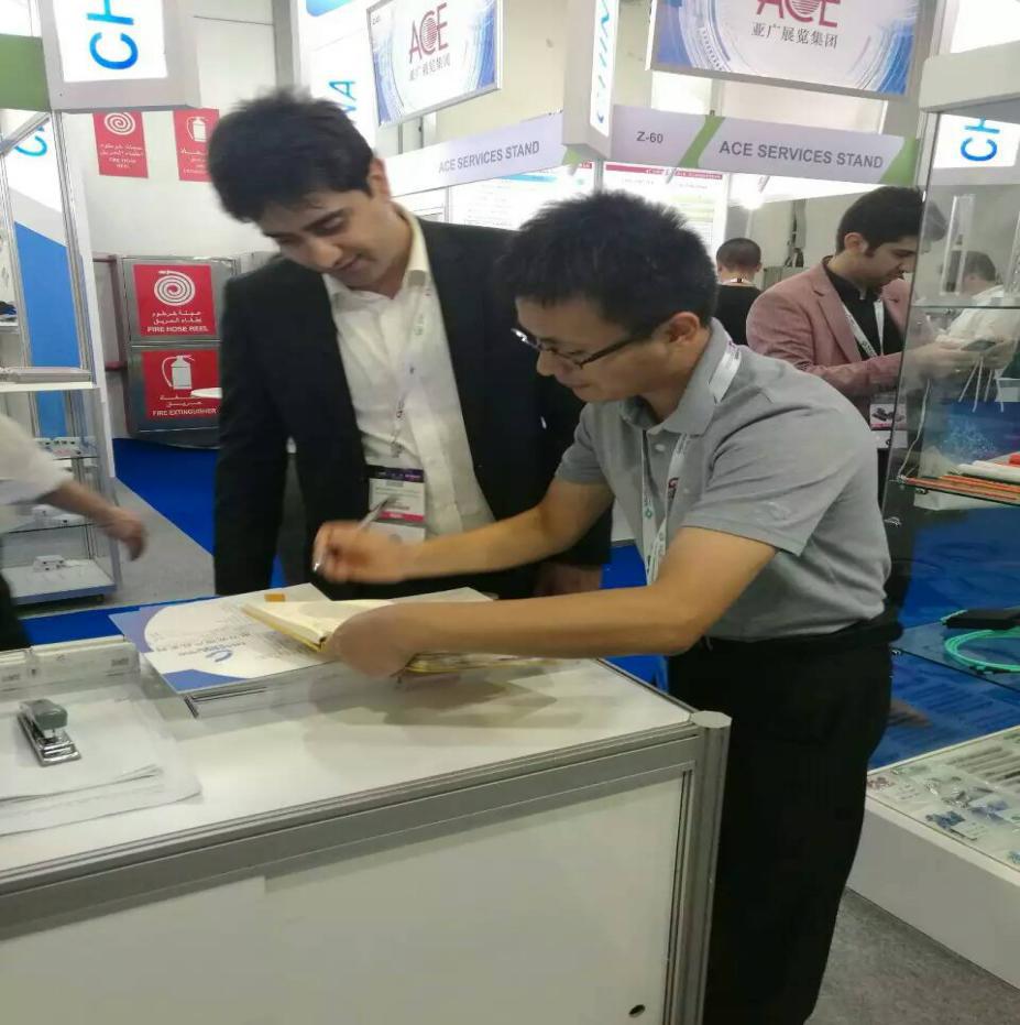 在展會(huì)期間,我們的員工接待了幾百名來自各國的客戶,并耐心回答了客戶的每一個(gè)問題,下面是現(xiàn)場的一些圖片。例如下圖的客戶就對他們并不太懂的電力光纜OPGW和ADSS很感興趣,我們的小伙伴正耐心講解。