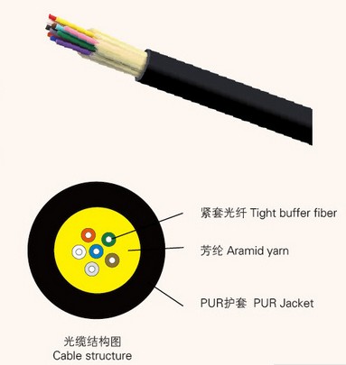 使用多根 Φ900μm 阻燃緊套光纖作為光傳輸介質,外覆一層芳綸作為受力加強單元,最外擠制一層聚氨酯(PUR)護套而成。